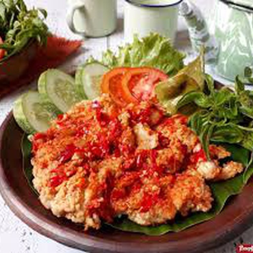Geprek chicken with super spicy special super spicy sauce on top of rice with rice from Japan.